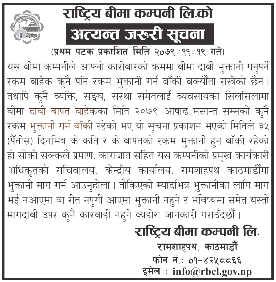 कुनै पनि ब्यक्ति, संघ, संस्था समेतलाई व्यवसायका सिलसिलामामा बीमा दाबी भुक्तानी गर्न बाँकी रहेको भए ३५ दिनभित्र के कति र के वापतको रकम भुक्तानी हुन बाँकी रहेको हो सो को प्रमाण कम्पनीको प्रमुख कार्यकारी अधिकृतको सचिवालय, केन्द्रीय कार्यालय, रामशाहपथ काठमाडौंमा भुक्तानी माग गर्न आउन अनुरोध गरेको छ ।