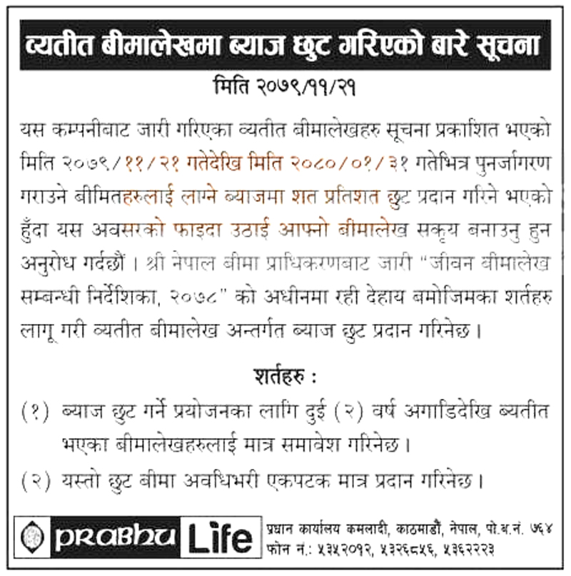 काठमाडौं । प्रभु लाइफ इन्स्योरेन्स कम्पनी लिमिटेडले ब्यतित बीमालेखमा ब्याज छुट प्रदान गर्ने भएको छ । कम्पनीले एक सूचना प्रकाशित गर्दै फागुन २१ गतेदेखि आगामी वैशाख ३१ गतेसम्म पुर्नजागरण गराउने बीमितहरुलाई लाग्ने ब्याजमा शत प्रतिशत छुट प्रदान गर्ने जनाएको हो ।