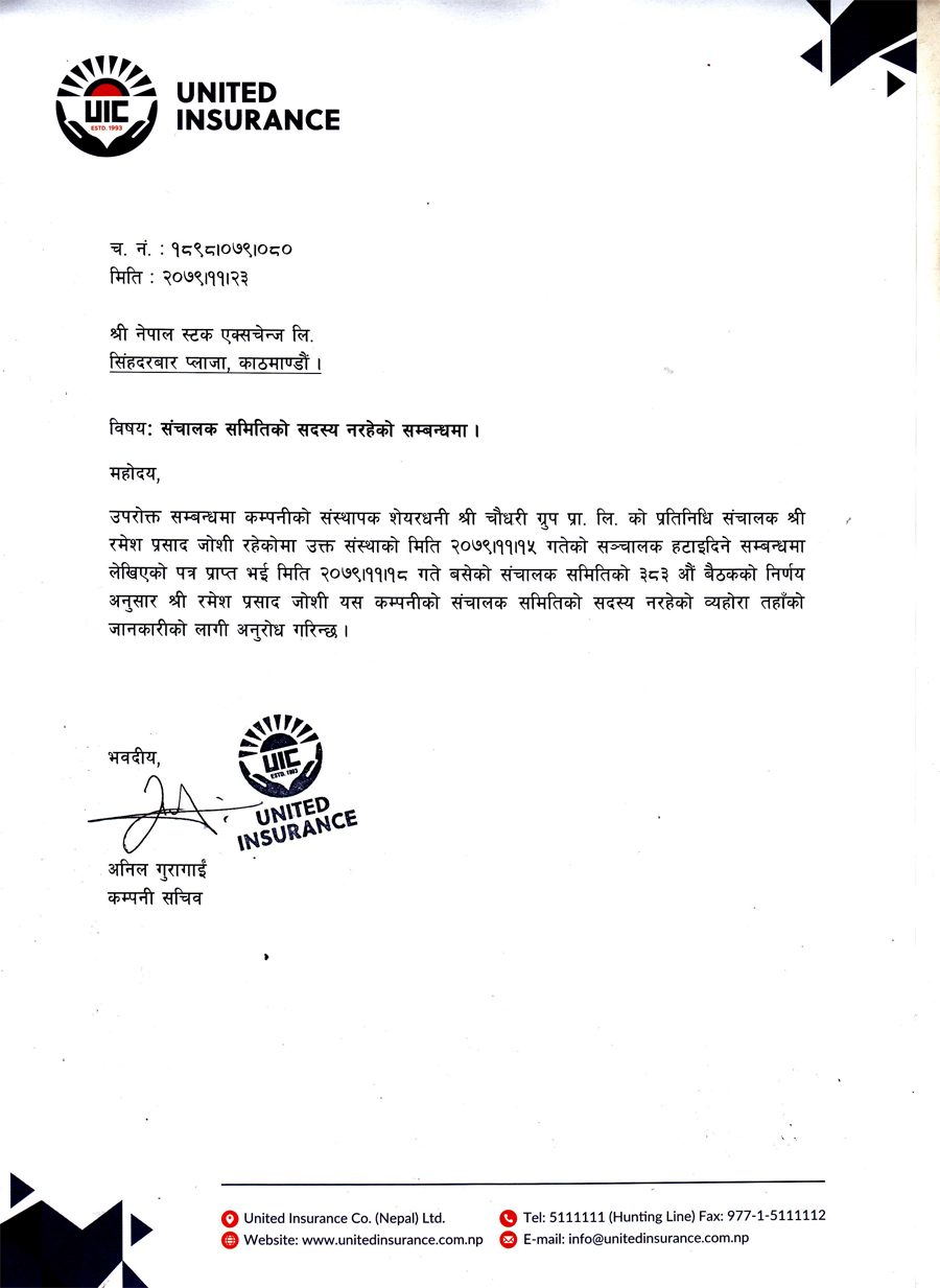 कम्पनीको संस्थापक शेयरधनी चौधरी ग्रुपको प्रतिनिधित्व संचालक जोशी रहेकोमा उक्त संस्थाको फागुन १५ गतेको संचालक हटाइदिने सम्बन्धमा लेखिएको पत्र प्राप्त अनुसार कम्पनीले संचालक जोशीलाई सो पदबाट हटाएका हुन् ।