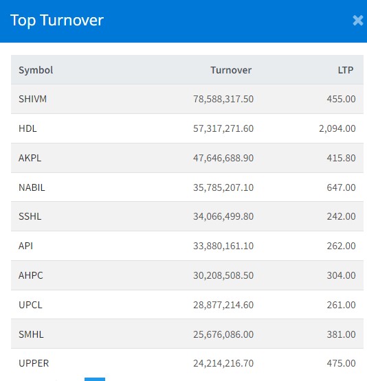 सर्वाधिक आज शिवम् सिमेन्ट्सको ७ करोड ८५ लाख रुपैयाँमाथिको कारोबार भएको छ । त्यस्तै, हिमालयन डिष्टिलरीको ५ करोड ७३ लाख, अरुण काबेली पावरको ४ करोड ७६ लाख, नबिल बैंकको ३ करोड ५७ लाख र शिव श्री हाइड्रोपावरको ३ करोड ४० लाख रुपैयाँमाथिको कारोबार भएको छ ।