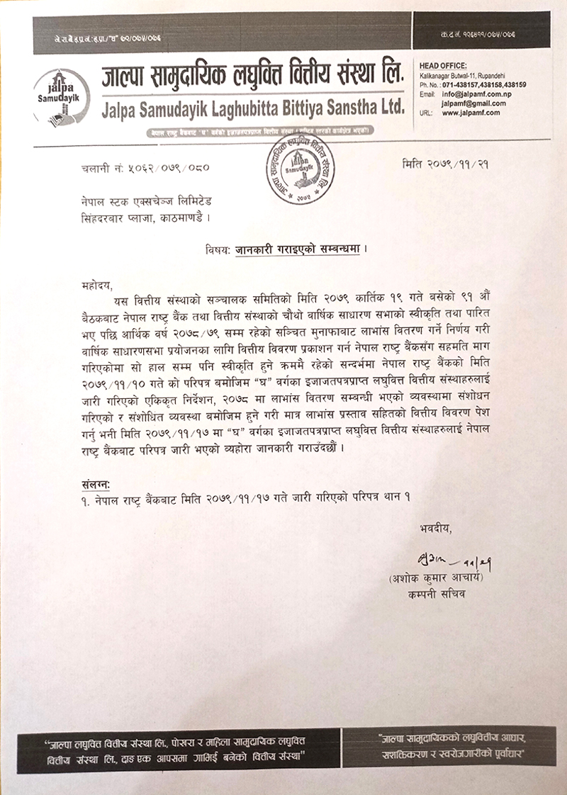 काठमाडौं । गत आर्थिक वर्ष २०७८।७९ को मुनाफाबाट आफ्ना शेयरधनीहरुलाई बम्पर लाभांश प्रस्ताव गरेको जाल्पा सामुदायिक लघुवित्तको वित्तीय विवरण नेपाल राष्ट्र बैंकबाट अझै पनि पारित भएको छैन ।