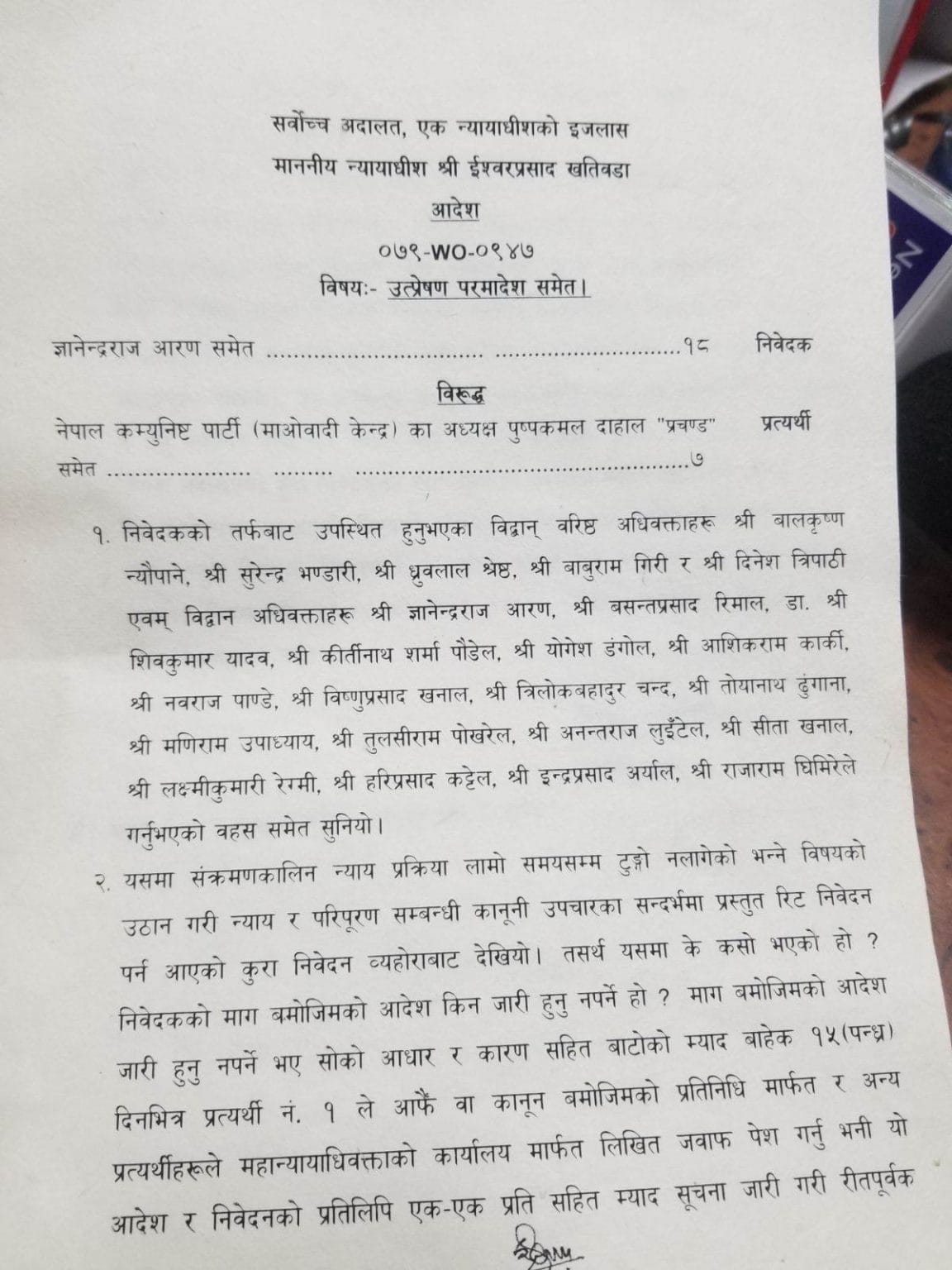 आदेशमा ‘यसमा माग बमोजिम आदेश जारी हुनु नपर्ने भए सो को आधार र कारणसहित बाटोको म्याद बाहेक १५ दिनभित्र प्रत्यार्थी नं १ (प्रधानमन्त्री प्रचण्ड) ले आफै वा कानुन बमोजिमको प्रतिनिधि (वारेस) मार्फत र अन्य प्रत्यर्थीहरुले महान्यायाधिवक्ताको कार्यालयमार्फत लिखित जवाफ पेश गर्नु’, भन्ने व्यहोरा उल्लेख छ । सो आदेश अनुसार प्रधानमन्त्री प्रचण्डले प्रधानमन्त्रीको हैसियतले पाउने महान्यायाधिवक्ता कार्यालयको सुविधा प्रयोग गर्न पाउने छैनन् । आफै वा आफूले मुकरर गरेको कानुन व्यवसायीले मात्रै इजलाश प्रचण्डको प्रतिनिधित्व गरेर जवाफ दिनुपर्नेछ । रिट निवेदनको पहिलो नम्वरका विपक्षीको रुपमा प्रधानमन्त्री प्रचण्डलाई बनाइएको छ । रिट निवेदनमै पनि प्रधानमन्त्री नभनी नेपाल कम्युनिष्ट पार्टी माओवादी केन्द्रका अध्यक्ष पुष्प कमल दाहाल प्रचण्ड उल्लेख गरिएको छ ।