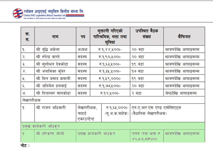 सभाले पारित विवरण अनुसार कम्पनीका प्रमुख कार्यकारी अधिकृत हरिकृष्ण जोशीले ४० लाख ८७ हजार ७ सय ७७ रुपैयाँ तलब तथा भत्ता बापत बुझेका छन् । साथै, लेखापरिक्षक राजन अधिकारीले १ लाख ६५ हजार रुपैयाँ लिएका छन् ।