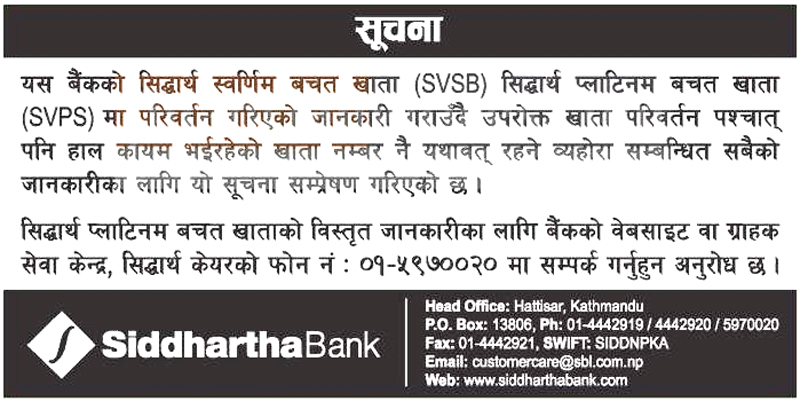 साथै उक्त खाता परिवर्तनपश्चात् पनि हाल कायम भइरहेको खाता नम्बर नै यथावत रहने बैंकले जनाएको छ ।