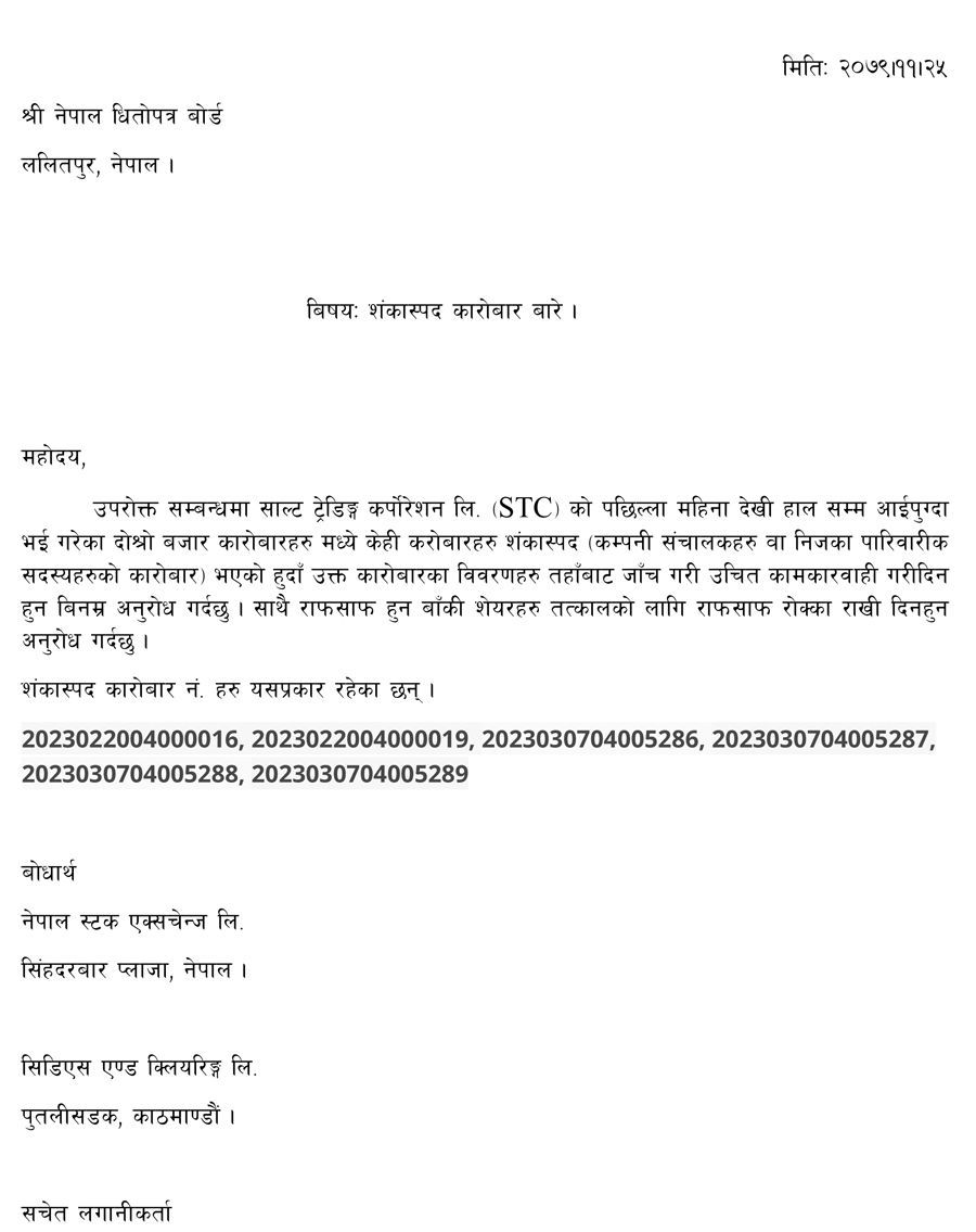 पछिल्ला केही महिनादेखि हालसम्म आइपुग्दा साल्ट ट्रेडिङको भइगरेका दोस्रो बजार कारोबारहरु मध्ये केही कारोबारहरु शंकास्पद रहेको लगानीकर्ताहरुले उल्लेख गरेका छन् ।