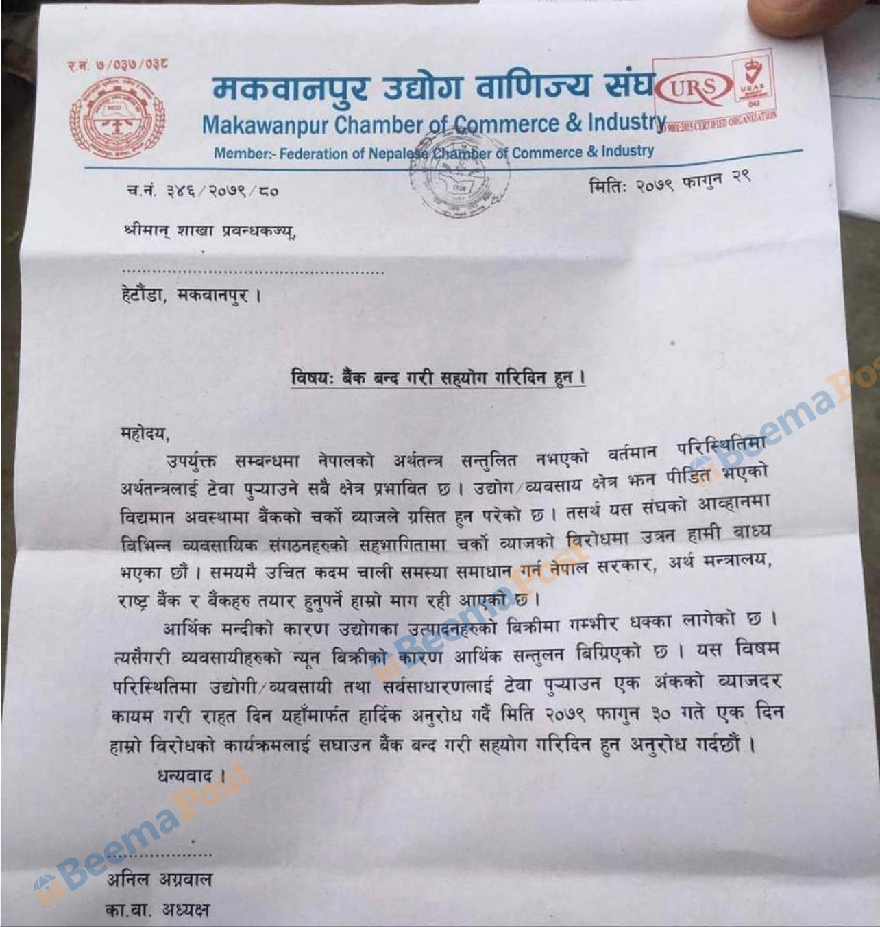 भोलि फागुन ३० गते हेटौडामा रहेको सबै बैंकका शाखाहरु बन्द गर्न उद्योग बाणिज्य संघद्धारा पत्राचार