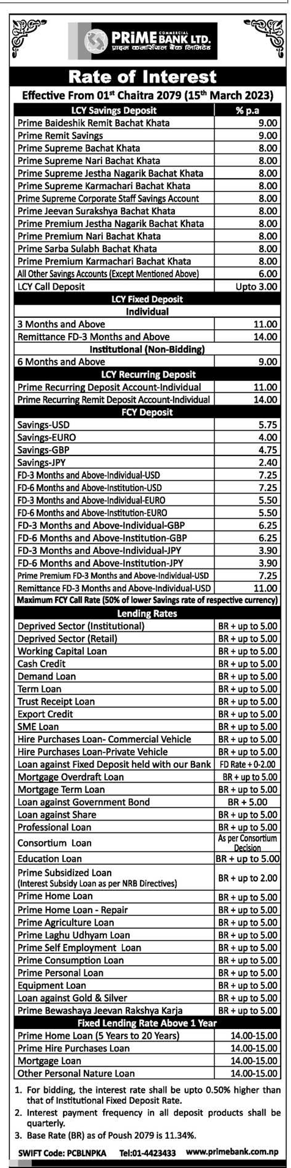 काठमाडौं । प्राइम कमर्सियल बैंक लिमिटेडले नयाँ ब्याजदर सार्वजनिक गरेको छ । बैंकले चैत एक गतेदेखि लागू हुनेगरी नयाँ ब्याजदर सार्वजनिक गरेको हो ।