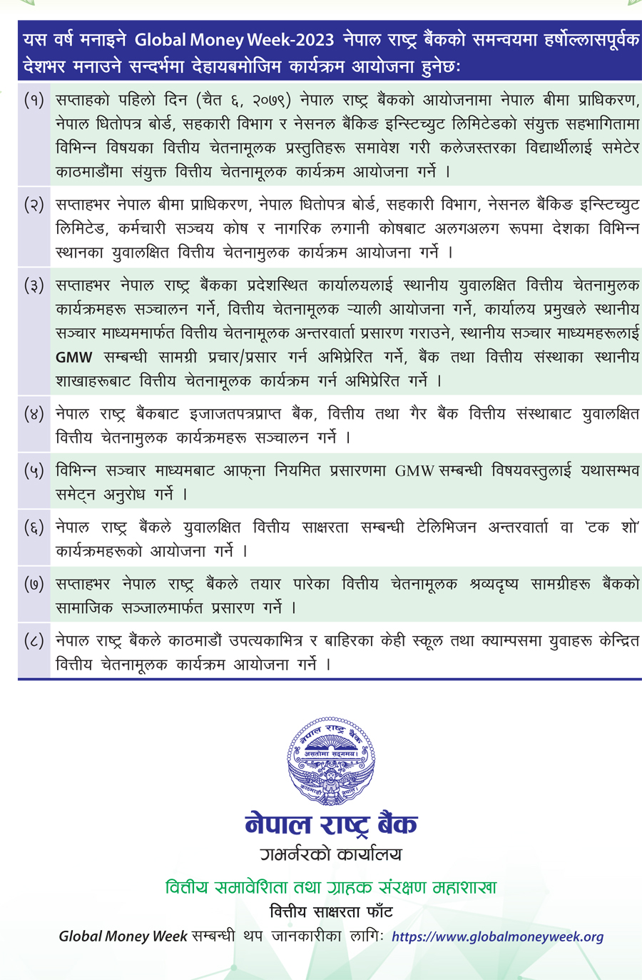 चैत ६ गतेदेखि नेपाल राष्ट्र बैंकको समन्वयमा ‘ग्लोबल मनी विक २०२३’ मनाइँदै, यस्तो छ तयारी