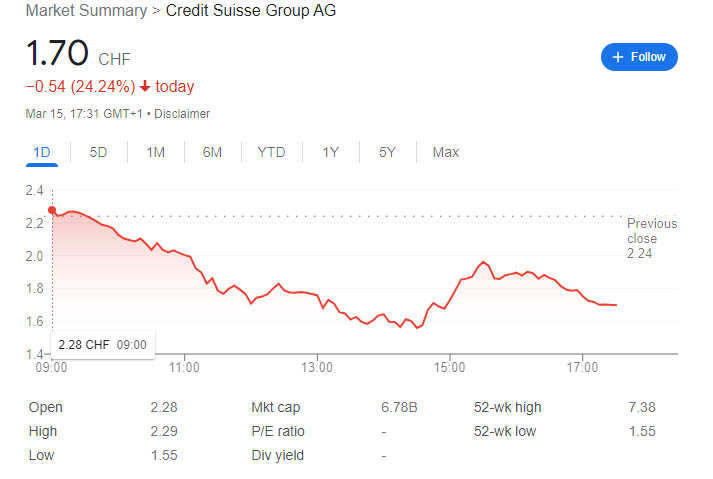 स्वीस सेन्ट्रल बैंकले आवश्यक तरलता सहयोग सहित सबै सहयोग गर्न तयार रहेको जनाएको छ । तर, शेयरको मूल्य लगातार घट््ने क्रम रोकिएको छैन । स्वीस क्रेडिटमा गम्भिर समस्या उत्पन्न भएपछि युरोपभरिका बैंकिङ क्षेत्रमा संकट आउन सक्ने हल्ला फैलिएको अन्तर्राष्ट्रिय सञ्चार माध्यमहरुले जनाएका छन् ।