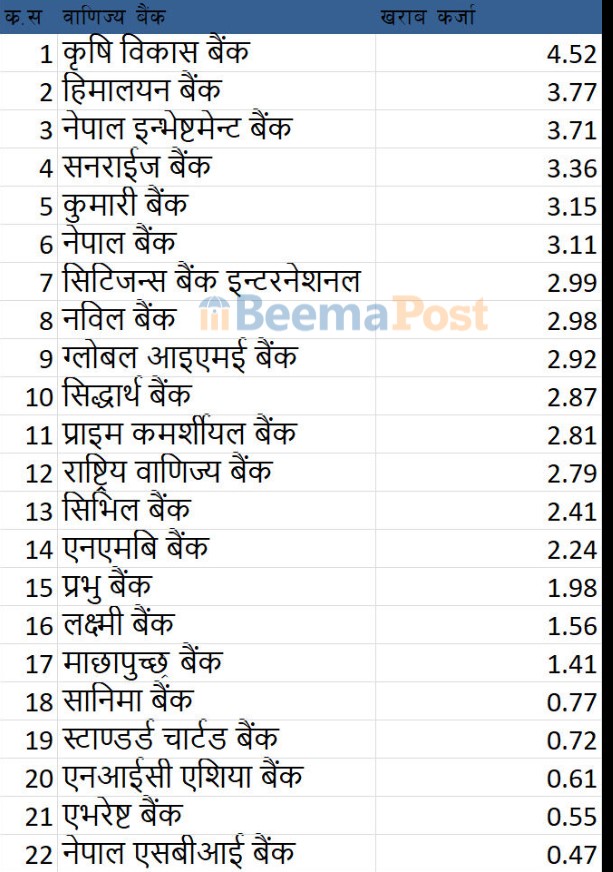 दोस्रो त्रैमाससम्ममा कृषि विकास बैंक, हिमालयन बैंक, नेपाल इन्भेष्टमेन्ट मेगा बैंक, सनराइज बैंक र कुमारी बैंकको खराब कर्जा ३ प्रतिशतभन्दा माथि पुगेको छ।