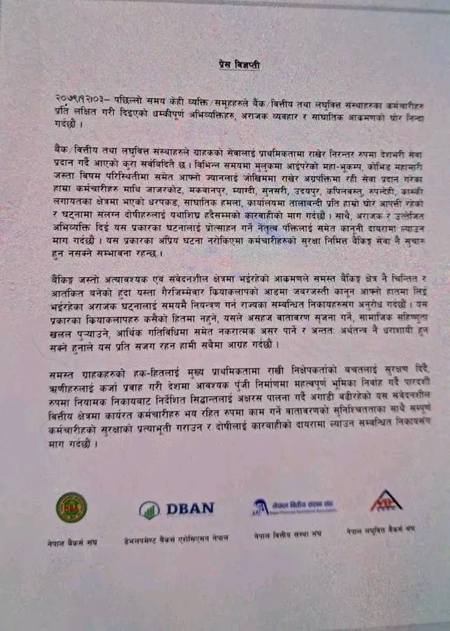नेपाल बैंकर्स संघ, डेबलपमेन्ट बैंकर्स डेभलपमेण्ट बैंकर्स एशेसिएसन नेपाल, नेपाल वित्तीय संस्था संघ नेपाल लघुवित्त बैंकर्स संघले शुक्रबार सयुक्त रुपमा विज्ञप्ति जारी गर्दै पछिल्लो समय केही व्यक्ति÷समूहले बैंकका कर्मचारीप्रति गरेको अभद्र व्यवहारको निन्दा गरेका हुन् ।