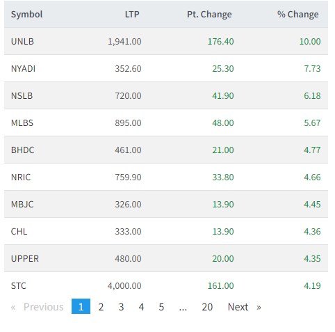 त्यस्तै, न्यादी, नयाँ सारथी, मानुपी लघुवित्त, विन्धवासिनी हाईड्रोपावर, नेपाल पुनर्बीमा, मध्य भोटेकोशी, छ्याङ्दी हाईड्रोपावर, अपर तामाकोशी र साल्ट ट्रेडिङको शेयर उकालो लागेको छ।