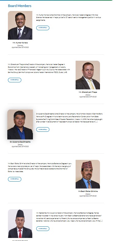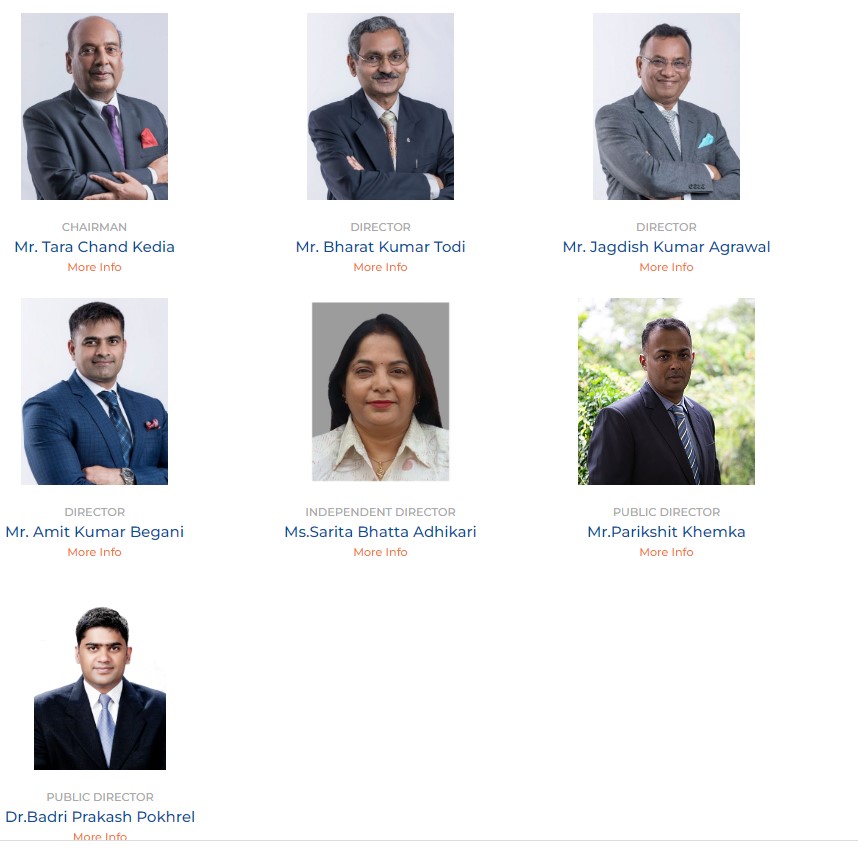 संचालक समितिमा घनश्याम थापा, सुवर्ण दास श्रेष्ठ, बद्रि बिशाल घिमिरे, केशव राज के.सी. र शिब हरी घिमिरे संचालकमा बहाल रहेका छन् ।