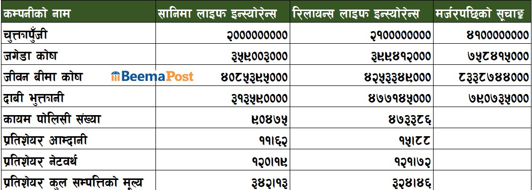 हाल रिलायन्स लाइफको चुक्ता पुँजी २ अर्ब १० करोड र सानिमा लाइफको २ अर्ब रुपैयाँ छ। मर्जरपछि चुक्ता पुँजी ४ अर्ब १० करोड रुपैयाँ पुग्नेछ।