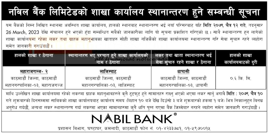 काठमाडौं । नबिल बैंक लिमिटेडको एक शाखा कार्यालय स्थानान्तरण भएको छ । बैंकको महाराजगंज शाखा कार्यालय स्थानान्तरण हुने भएको हो ।