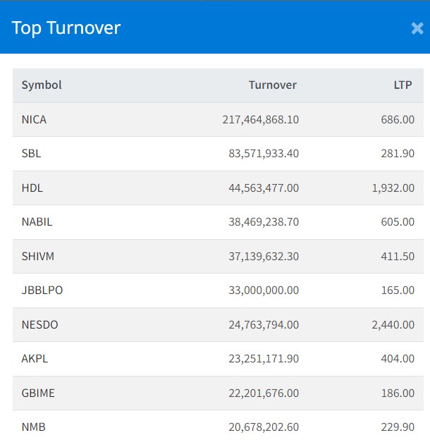 त्यस्तै, सिद्धार्थ बैंकको ८ करोड ३५ लाख, हिमालयन डिष्टिलरीको ४ करोढ ४५ लाख, नबिल बैंकको ३ करोड ८४ लाख रुपैयाँ र शिवम् सिमेन्ट्सको ३ करोड ७१ लाख रुपैयाँमाथिको कारोबार भएको छ ।