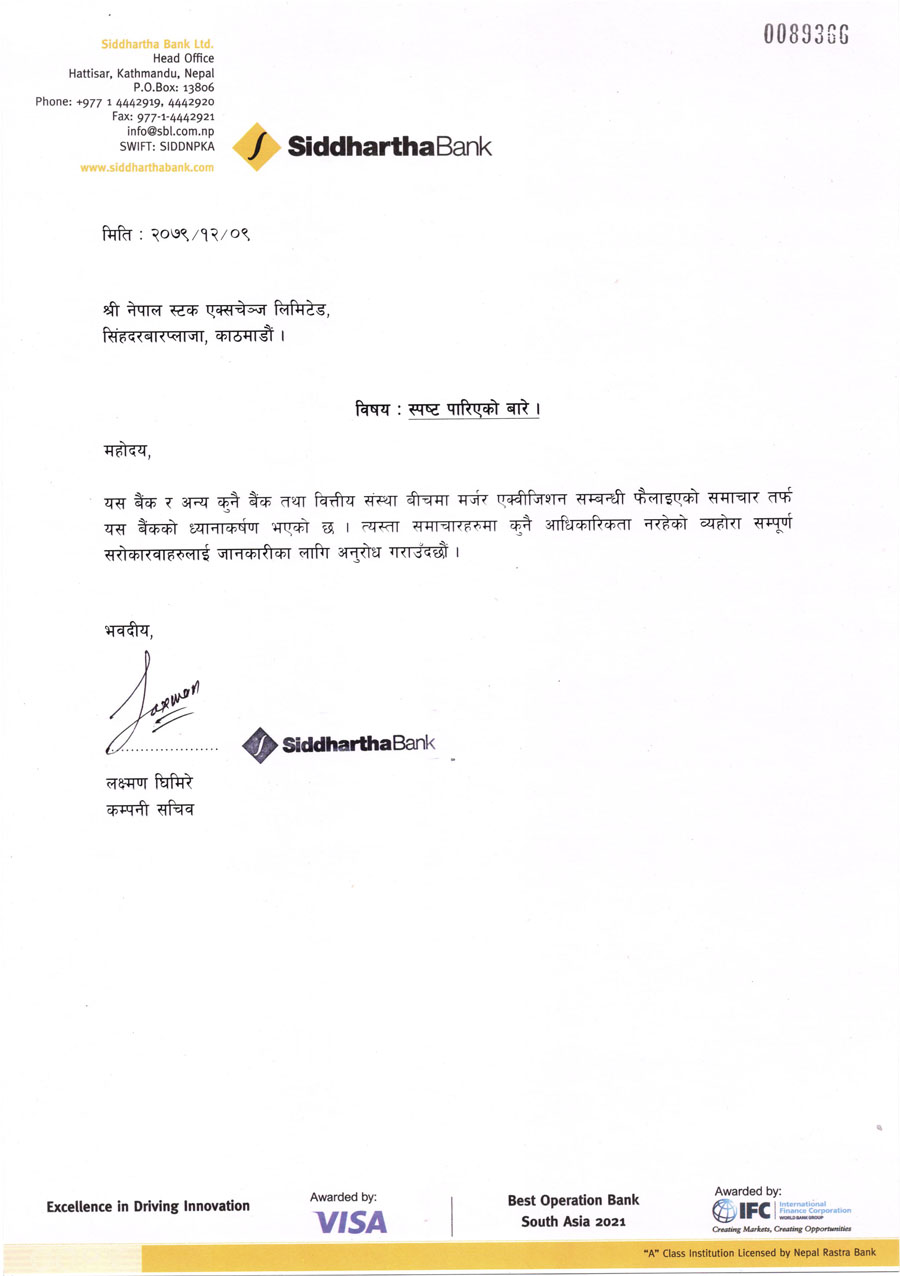 यसैबीच बैंकले नेप्सेसमक्ष एक सूचना प्रकाशित गर्दै अन्य बैंक तथा वित्तीय संस्था बीचमा मर्जर सम्बन्धी फैलाइएको समाचार तर्फ बैंकले ध्यानाकर्षण जनाएको हो । साथै त्यस्ता खालका समाचारहरुमा कुनै आधिकारिकता नभएको बैंकले जनाएको छ ।