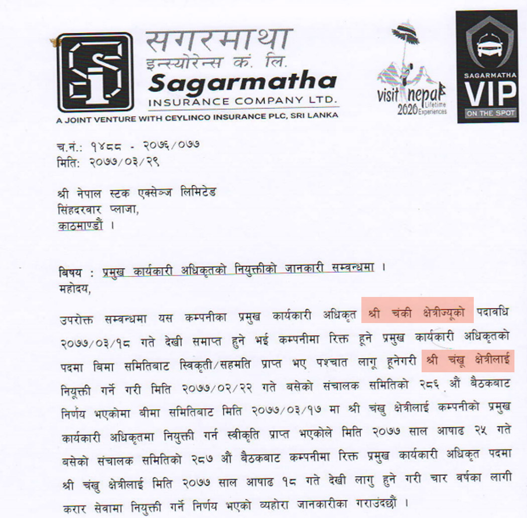 सगरमाथा इन्स्योरेन्स कम्पनीका सिईओ हुँदा देखि नै तीन थरी नाम राखिएको थियो । चंखु क्षेत्री असली नाम भएका व्यक्ति अहिले पुनः मर्जरपछि गत फागुन २९ गतेदेखि नयाँ बनेको सगरमाथा लुम्बिनी इन्स्योरेन्स कम्पनीको सिईओमा नियुक्त गर्न सञ्चालक समितिले प्रस्ताव गरेको छ । यसअघि २०७७ सालमा सिईओमा नियुक्त हुँदा नेप्सेले लेखेको एउटै पत्रमा माथि चंकी क्षेत्री र तल चंखु क्षेत्री भनेर उल्लेख गरिएको तथ्य भेटिएको छ ।