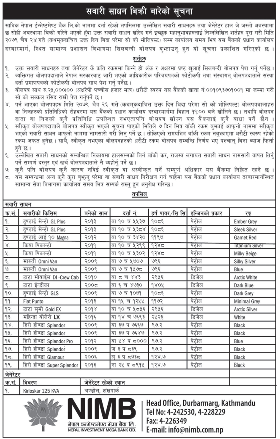 बैंकले हुण्डाई सेन्ट्रो ‘जीएल प्लस’ दुईवटा, हुण्डाई आई १० म्याग्ना, किया पिकान्टो दुईवटा, मारुती ओम्नी भ्यान दुईवटा, टाटा मोबाइल डीएल क्रिउ क्याब, टाटा इन्डीका, हुण्डाई सेन्ट्रो जीएलएस, प्ल्याट पुन्टो, टाटा सुमो गोल्ड एक्स, महिन्द्रा बोलेरो एलएक्स, हिरो होण्डा स्प्लेण्डर तीनवटा, हिरो होण्डा स्प्लेण्डर प्रो, हिरो होण्डा ग्ल्यामर र हिरो होण्डा सुपर स्प्लेण्डर गरी कुल १९ वटा सवारी साधन बिक्री गर्न लागेको हो ।