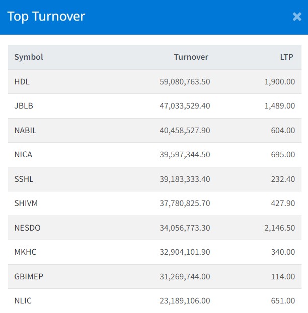 सर्वाधिक हिमालयन डिष्टिलरीको ५ करोड ९० लाख रुपैयाँमाथिको कारोबार भएको छ । कम्पनीको शेयरमूल्य आज ३ प्रतिशतले बढेसँगै सर्वाधिक कारोबार हुन पुगेको हो ।