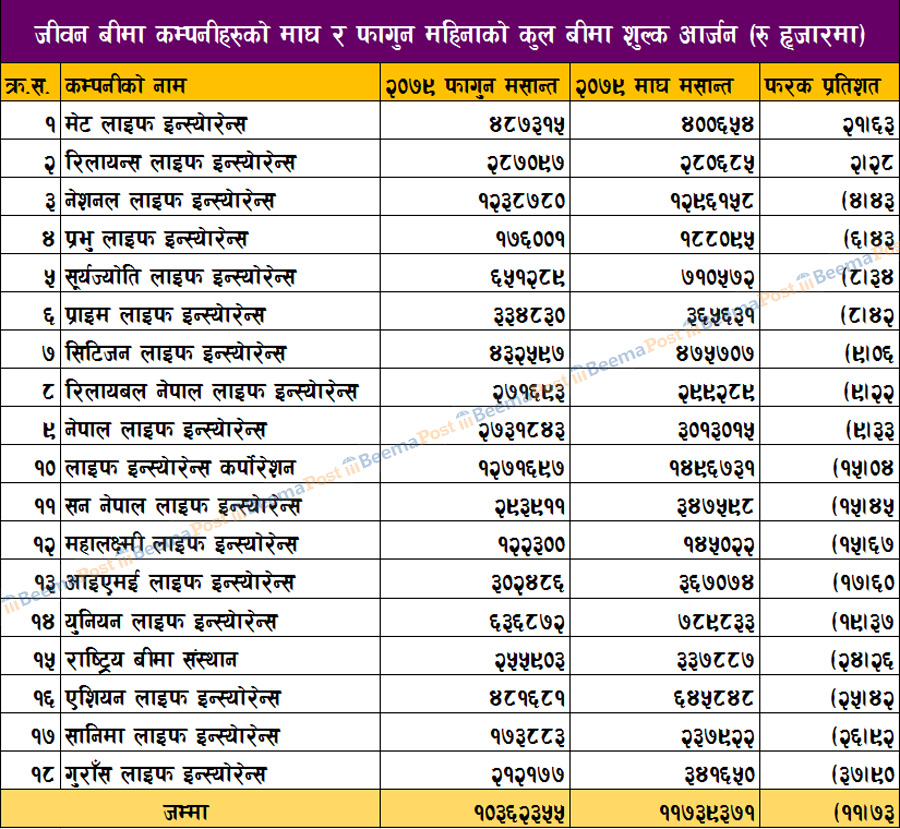 फागुनमा मात्रै जीवन बीमा कम्पनीको कुल बीमाशुल्क आर्जन १० अर्बमाथि, अधिकांशको व्यवसाय घट्दा मेट र रिलायन्स लाइफको देखियो प्रगति (तथ्याङ्कसहित)