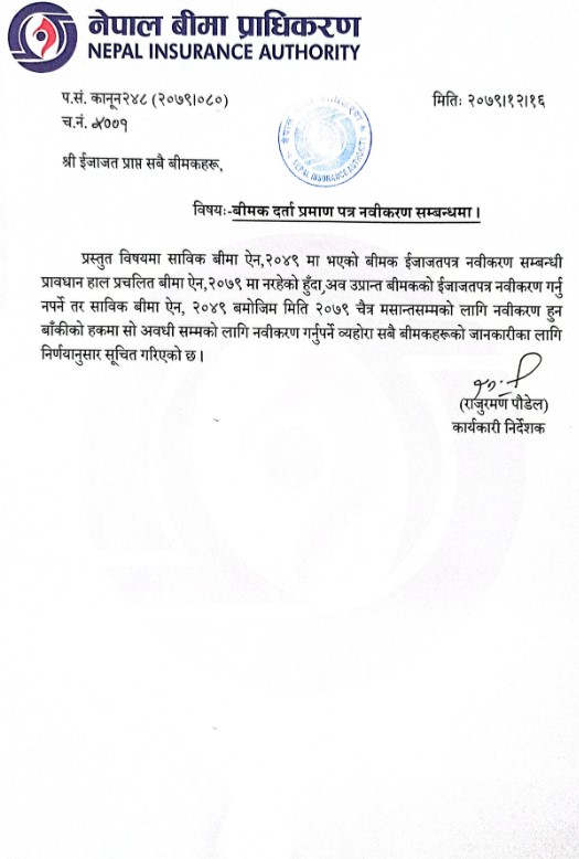 तर प्राधिकरणले बीमा ऐन, २०४९ बमोजिम २०७९ चैत्र मसान्तसम्मको लागि नविकरण हुन बाँकीको हकमा सो अवधिसम्मको लागि नविकरण गनुपर्ने जानकारी सबै बीमा कम्पनीहरुलाई गराएको बीमा प्राधिकरणका कार्यकारी निर्देशक राजुरमण पौडेलले बताए ।