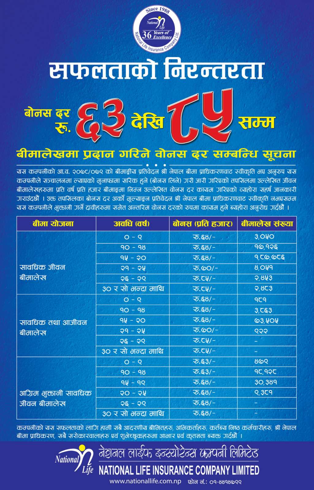 नेशनल लाइफ इन्स्योरेन्सको नयाँ बोनसदर सार्वजनिक, अधिकतम ८५ रूपैयाँसम्म बोनश पाउने