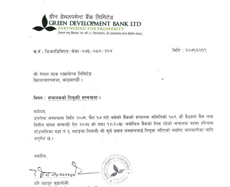 काठमाडौं । ग्रीन डेभलपमेन्ट बैंक लिमिटेडको संचालक पदमा सुुर्य प्रसाद लम्साललाई नियक्त गरेको छ ।