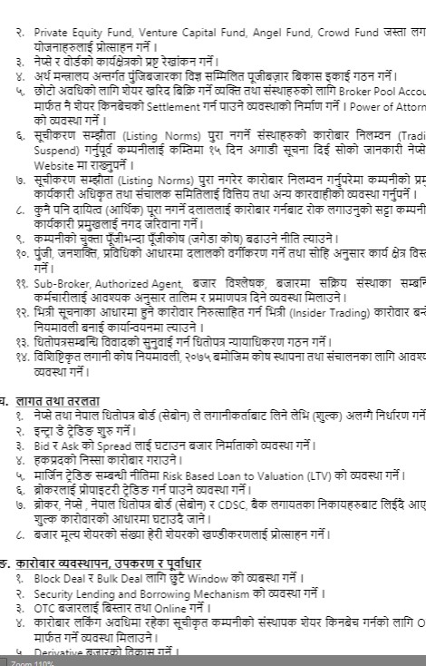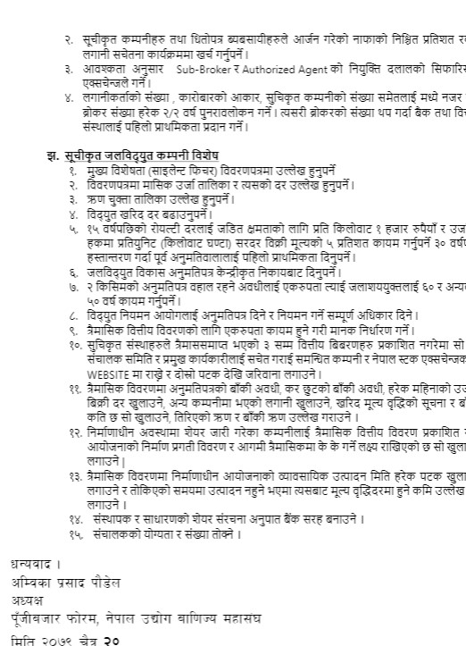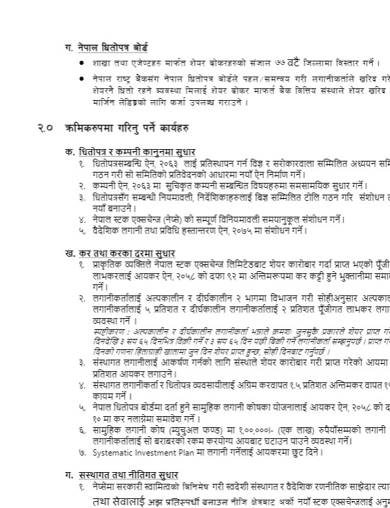 फोरमले अर्थ मन्त्रालय, राष्ट्र बैंक, धितोपत्र बोर्डले तत्काल गरिनु पर्ने कार्य, क्रमिक रुपमा गर्नुपर्ने कार्य धितोपत्र र कम्पनी कानुनमा सुधार कर तथा करका दरमा सुधार, सस्थागत तथा नीतिगत सुधार, लागत तथा तरलता, कारोबार व्यवस्थापन, उपकरण र पूर्वाधारका विषयमा सुझाव दिएका छन् ।