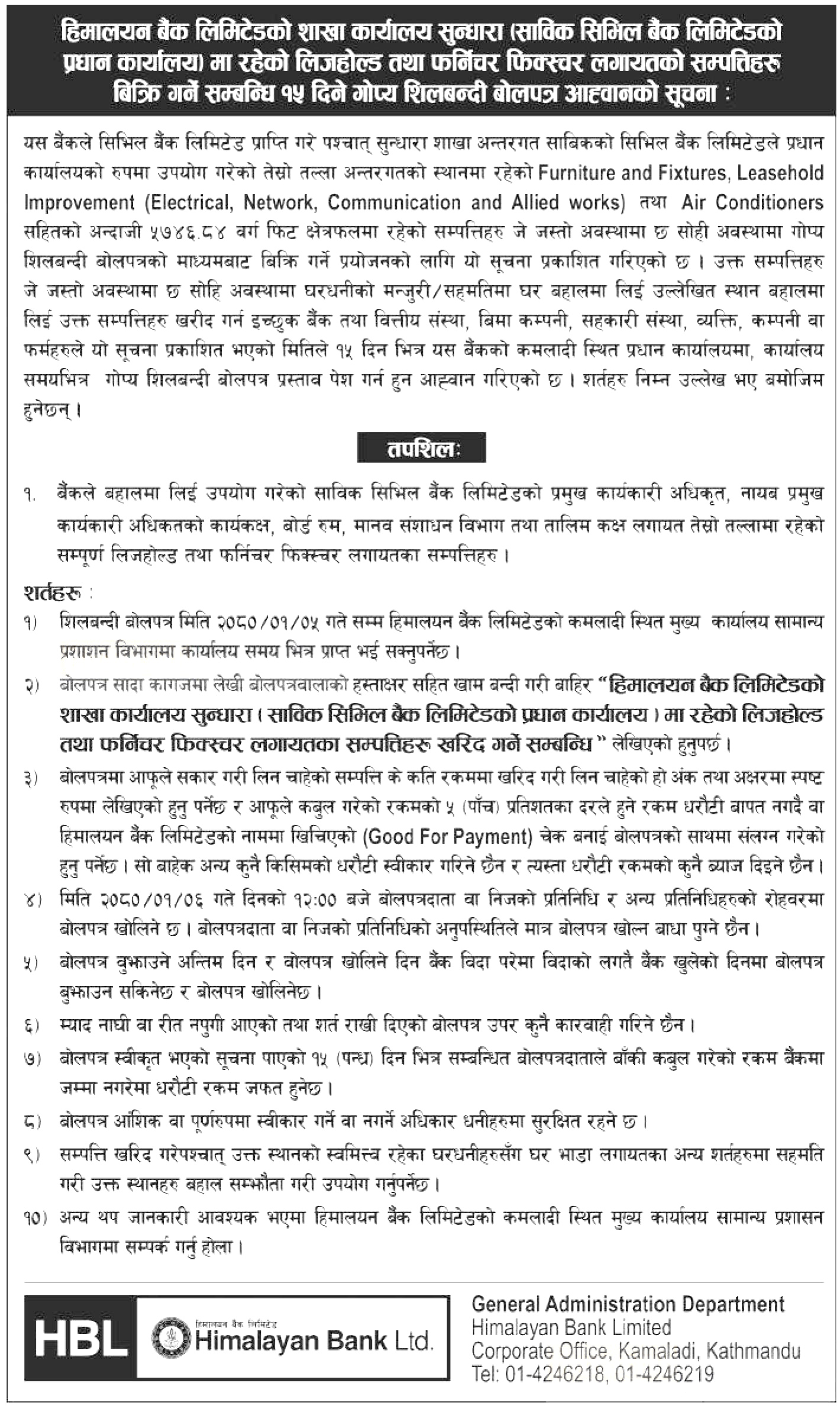 काठमाडौं । हिमालयन बैंक लिमिटेडले स्थिर सम्पत्ति बिक्री गर्ने भएको छ । बैंकले शाखा कार्यालय सुन्धारा (साविक सिभिल बैंक लिमिटेडको प्रधान कार्यालय) मा रहेको लिजहोल्ड तथा फर्निचर फिक्स्चर लगायतको सम्पत्तिहरु लिलाम गर्न लागेको हो ।