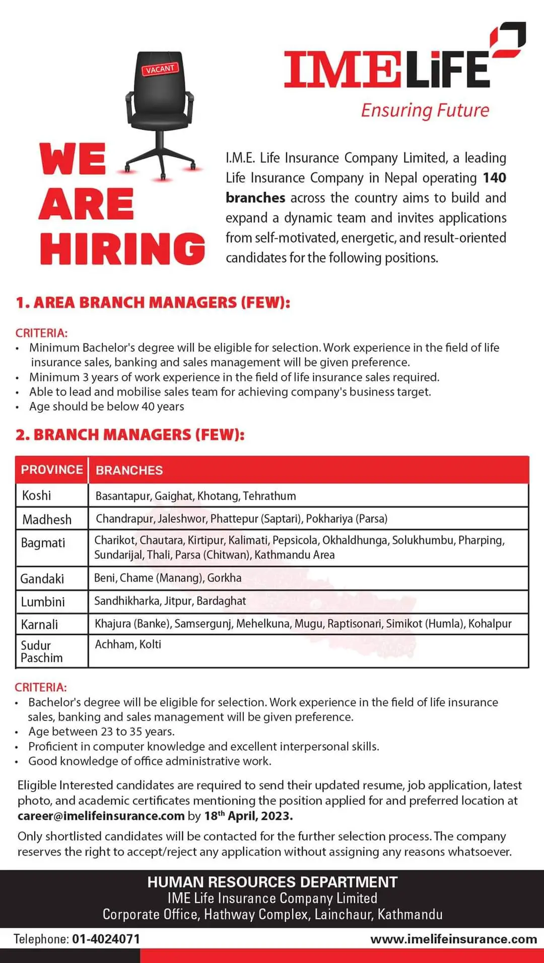 कम्पनीले एरिया ब्रान्च म्यानेजर र ब्रान्च म्यानेजर पदमा केहि संख्याले कर्मचारी माग गरेको छ । सो पदहरुमा आवेदन दिनको लागि उम्मेदवारले मान्यता प्राप्त शैक्षिक संस्थाबाट स्नातक तह उत्तिर्ण गरेको हुनुपर्ने जनाएको छ ।