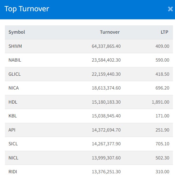 त्यस्तै, नबिल बैंकको २ करोड ३२ लाख, गुराँस लाइफ इन्स्योरेन्सको २ करोड १७ लाख, एनआइसी एशिया बैंकको १ करोड ८५ लाख र हिमालयन डिष्टिलरीको १ करोड ५० लाख रुपैयाँमाथिको कारोबार भएको छ ।