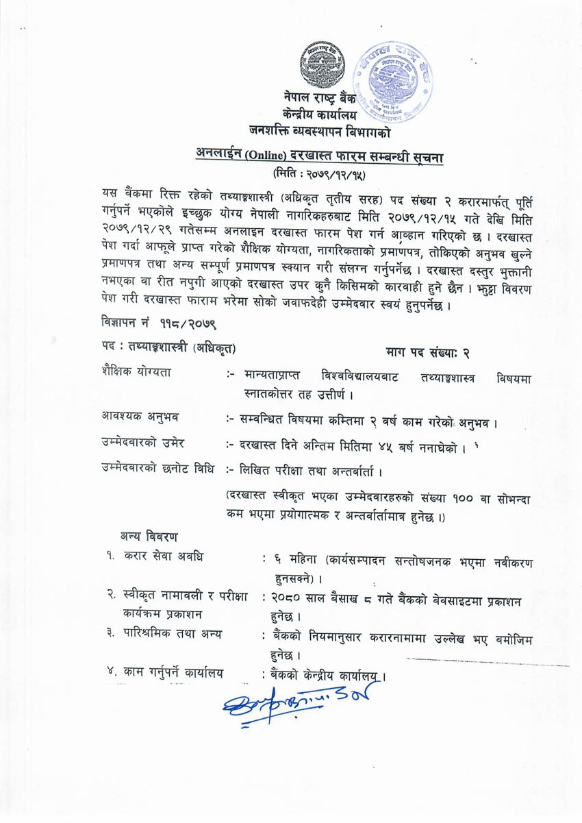 छ महिने करार अवधीको सो पदमा कार्य सम्पादनको आधारमा नविकरण हुने सूचनामा जनाइएको छ । आवेदन दिन इच्छुक योग्यता पुगोके व्यक्तिले https://jobs.nrb.org.np/ मार्फत अनलाईनबाटै आवेदन दिनुपर्नेछ ।
