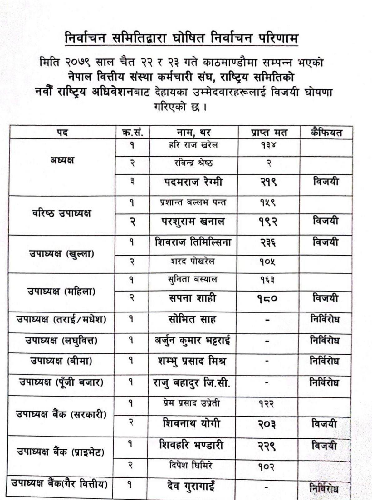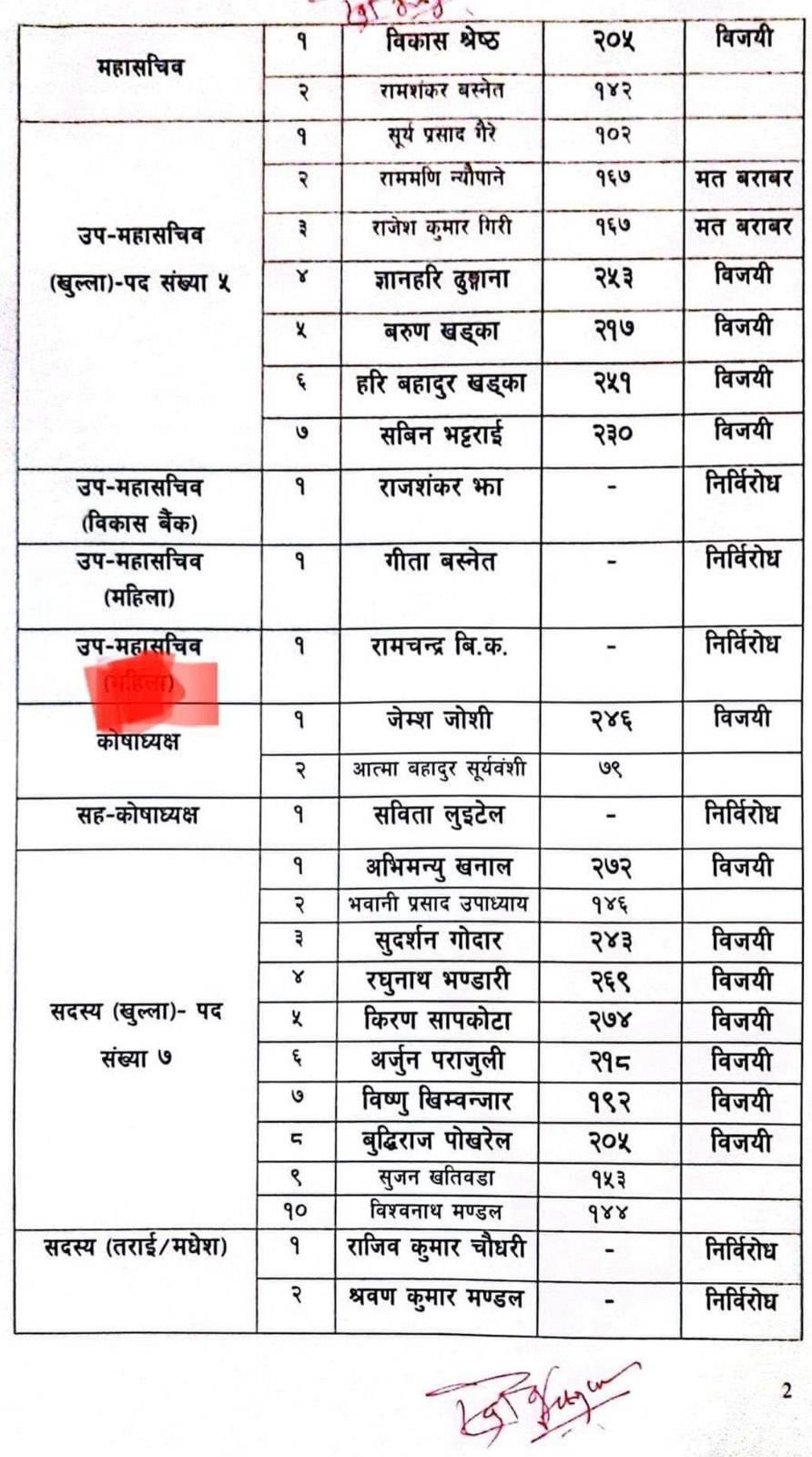 त्यस्तै, उप महासचिवमा विकास बैंकको तर्फबाट रामशंकर झा, महिलाको तर्फबाट गिता बस्नेत, रामचन्द्र विक निर्वाचित भएका छन् ।