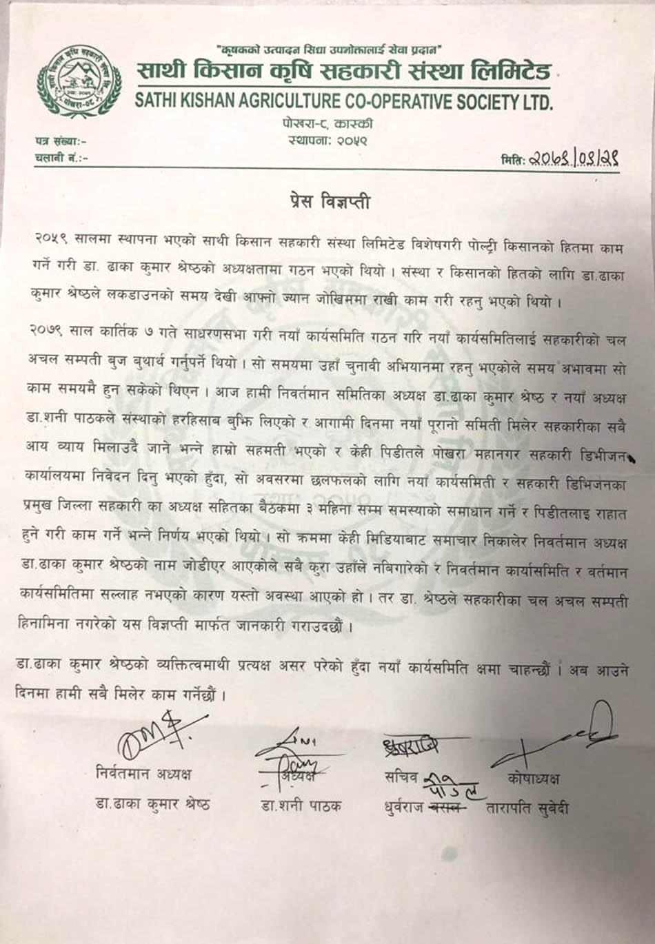 पुरानो कार्य समितिले छोडेपछि संस्था स्वतः नयाँ कार्यसमितिको हातमा पुग्दछ । पुरानो कार्यसमितिले भ्रष्टाचार गरेको र हर हिसाब दुरुस्त नराखेको अवस्थामा मात्रै पुरानो र नयाँ कार्य समितिको छुट्टाछुट्टै हुन्छ । साथी किसान सहकारीमा त्यस्तै अवस्था देखिएको छ । जसमा तीन महिनाभित्रमा समस्याको समाधान गर्ने सहमति भएको उल्लेख छ ।