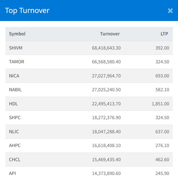 सर्वाधिक शिवम् सिमेन्ट्सको ६ करोड ८४ लाख रुपैयाँमाथिको कारोबार भएको छ । त्यस्तै, सानिमा मिडिल तमोर हाइड्रोपावरको ६ करोड ६५ लाख, एनआइसी एशिया बैंकको २ करोड ७० लाख, नबिल बैंकको २ करोड ७० लाख र हिमालयन डिष्टिलरीको २ करोड २४ लाख रुपैयाँमाथिको कारोबार भएको छ ।