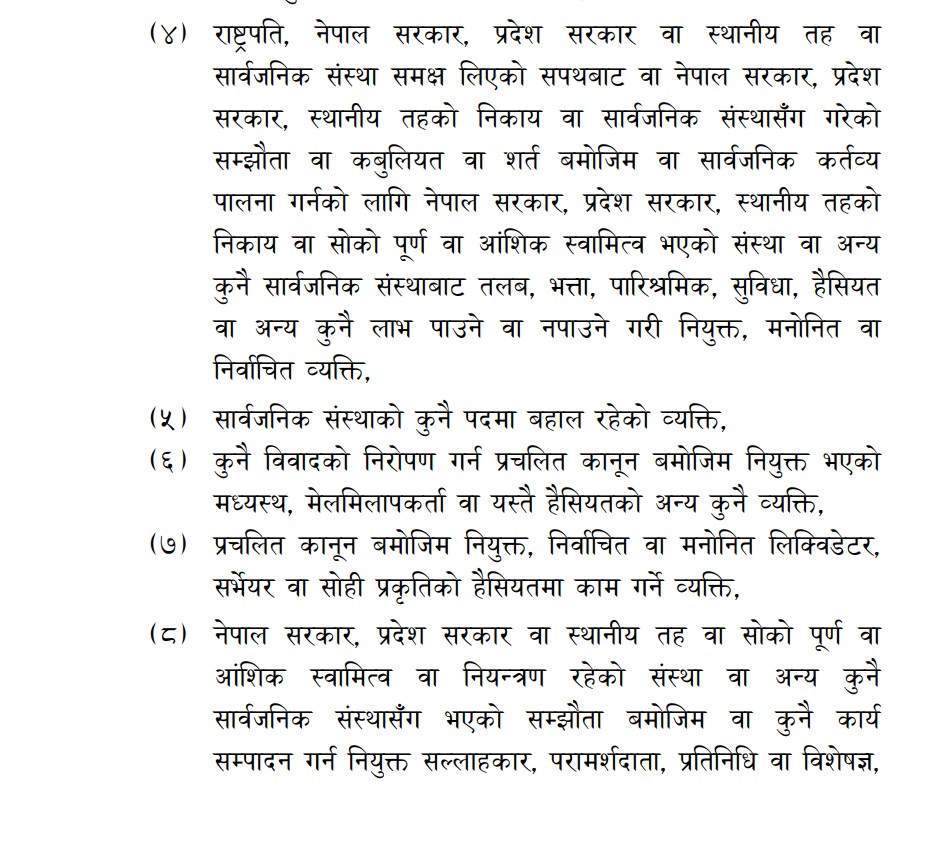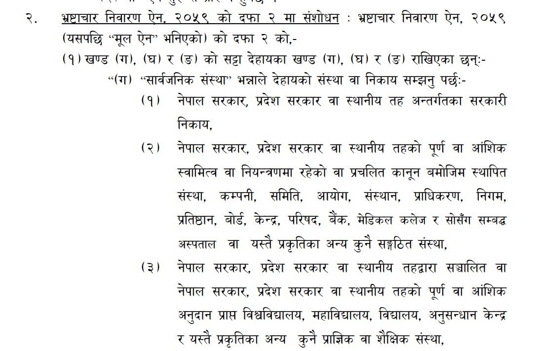 नयाँ व्यवस्था अनुसार बैंक, बीमा कम्पनी र अन्य पब्लिक कम्पनीमा कार्यरत कर्मचारीहरुको आम्दानी खर्च र उनीहरुको सम्पत्तिको स्रोत समेत आयोगको अनुसन्धानको दायराभित्र पर्नेछ ।
