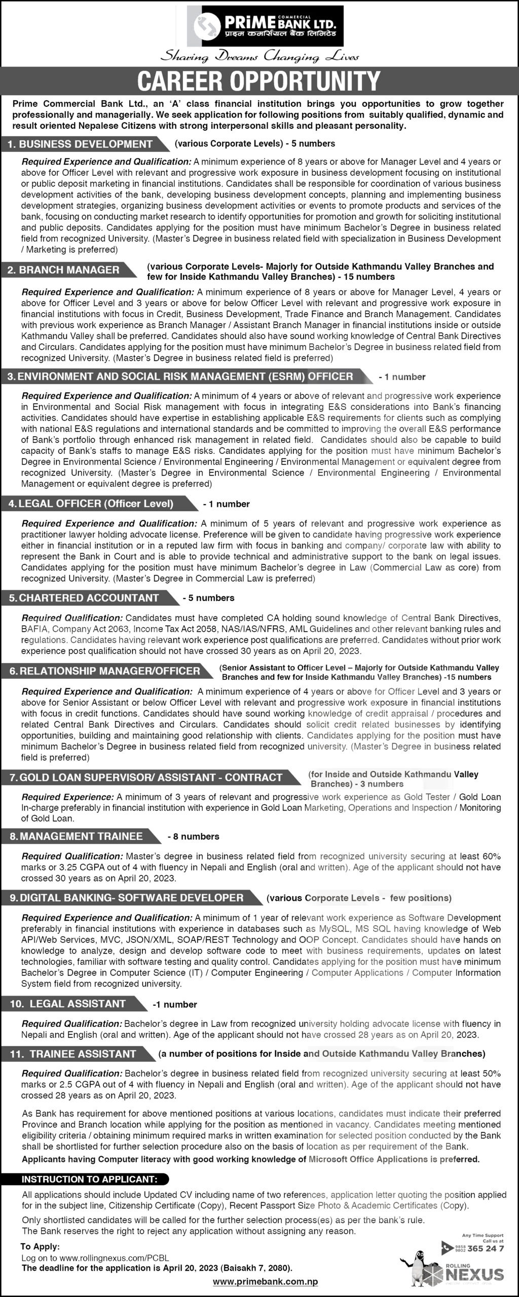 इच्छुक उम्मेदवारले बैशाख ७ गतेभित्र बैंकको वेवसाइट https://www.primebank.com.np/ मार्फत आवेदन दिन सक्नेछन् ।