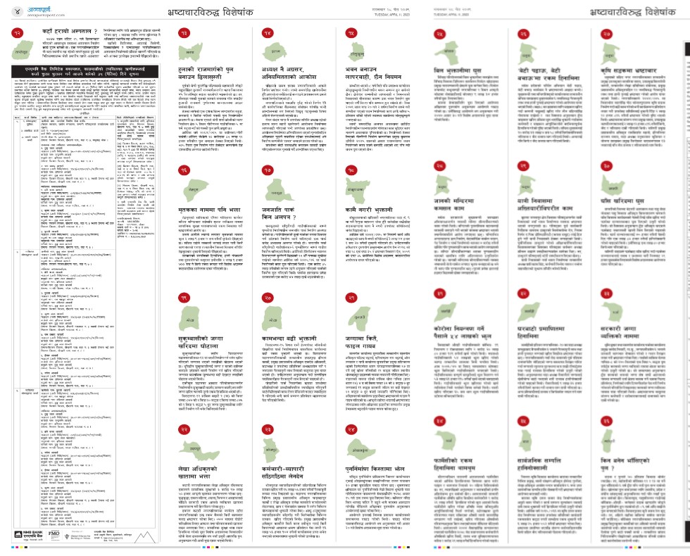 १२ पृष्ठको भ्रष्टाचार विरुद्धको विशेषांकमा ‘शतखिल’ एउटै शिर्षकमा नेपालका देशैभरिमा घटाइएका भ्रष्टाचारजन्य काण्डहरुको सूचि सार्वजनिक गरिएको छ । नेपालका चर्चित भ्रष्टाचारजन्य काण्डहरुको १०० वटा सूचिमा प्रत्येक जिल्लाबाट कम्तीमा एक वटाका दरले समावेश गरिएको छ ।