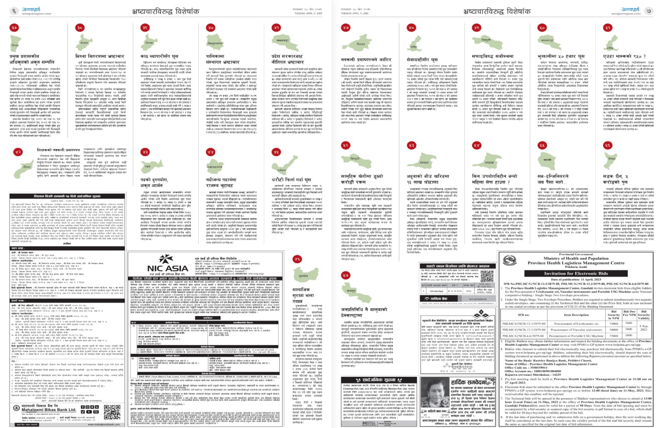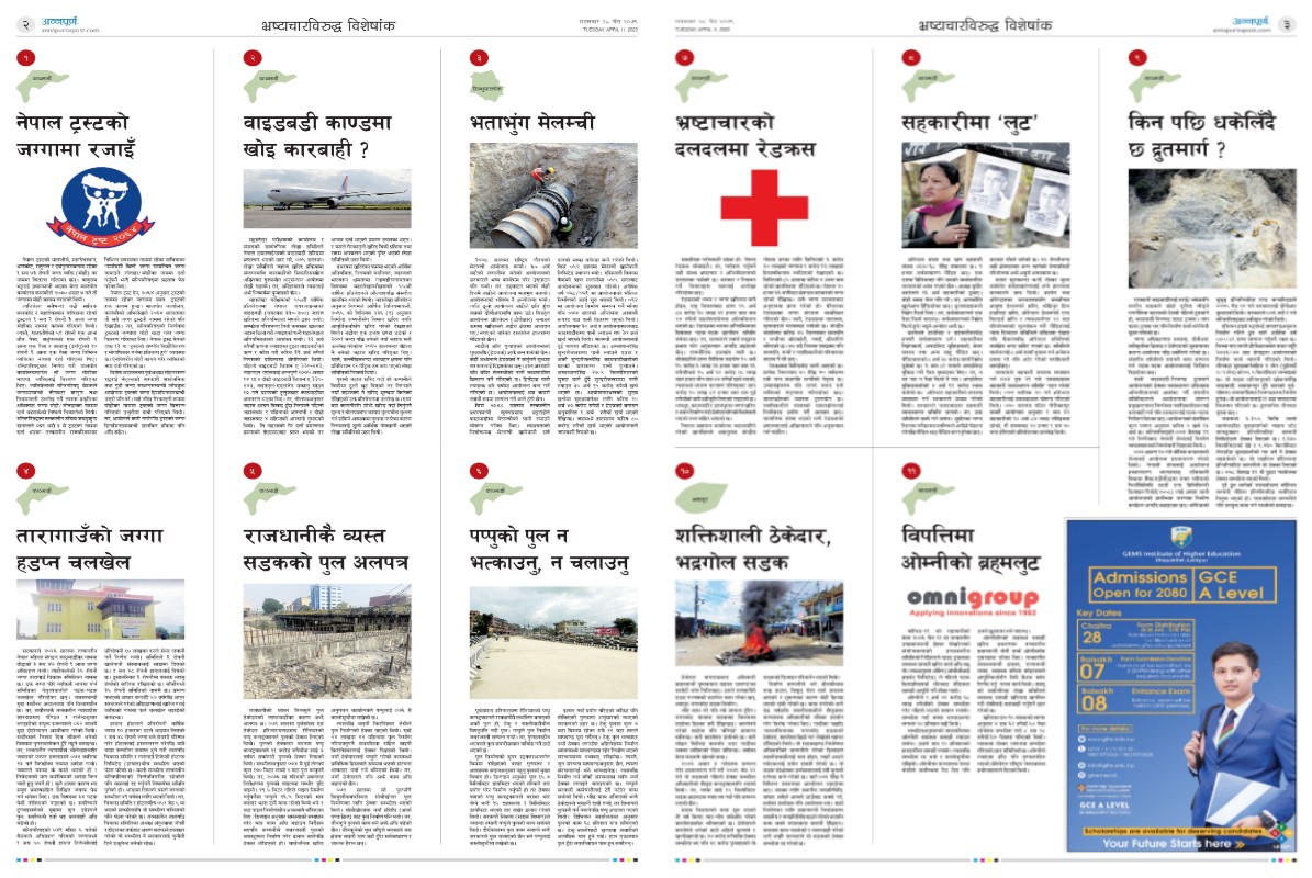 काठमाडौं । नेपाली पत्रकारिता क्षेत्रमा विरलै हुने अभ्यास हिजो प्रकाशित अन्नपूर्णपोष्ट दैनिकले गरेको छ । अखण्ड भण्डारी सम्पादक रहेको अन्नपूर्ण पोष्टको वर्ष २१, अंक ३३२ को चैत्र २८ गतेको नियमित अंकलाई भ्रष्टाचार विशेष अंकको रुपमा प्रकाशित गरेको हो ।