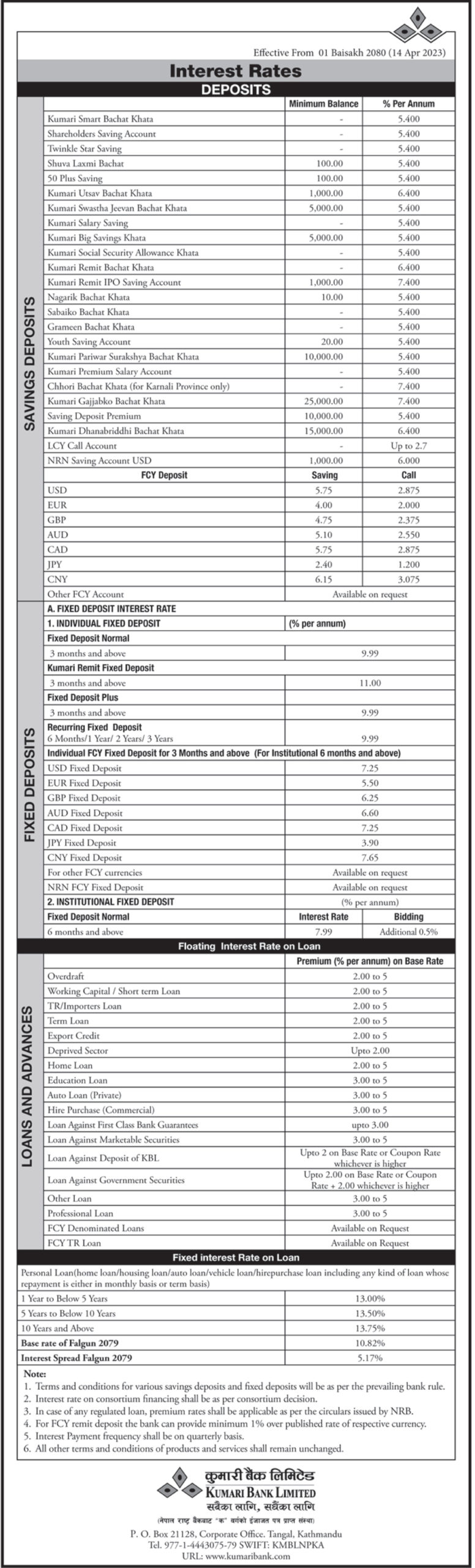 काठमाडौ । कुमारी बैंक लिमिटेडले नयाँ ब्याजदर प्रकाशित गरेको छ । बैंकले २०८० साल वैशाख महिनाका लागि घटाएर नयाँ ब्याजदर सार्वजनिक गरेको हो ।