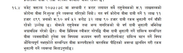 महालेखाले बीमाशुल्क भुक्तानी लिएपछि दायित्व स्वीकार गरेको विषयमा छानविन हनुपर्ने सझुाव सरकारलाई अघि सारेपछि तत्कालको लागि सरकारी कोषबाट कोरोना बीमाको दावी भुक्तानी दिने कार्य अबैध ठहर भएको छ ।