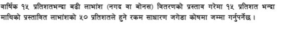 राष्ट्र बैंक ऐन, २०५८ को दफा ७९ ले दिएको अधिकार प्रयोग गरी यो निर्देशन जारी गरिएको जनाएको छ।वार्षिक १५ प्रतिशतभन्दा बढी लाभांश (नगद वा बोनस) वितरणको प्रस्ताव गरेमा १५ प्रतिशत भन्दा माथिको प्रस्तावित लाभांशको ५० प्रतिशतले हुने रकम साधारण जगेडा कोषमा जम्मा गर्नुपर्ने संसोधित व्यवस्थामा रहेको छ।