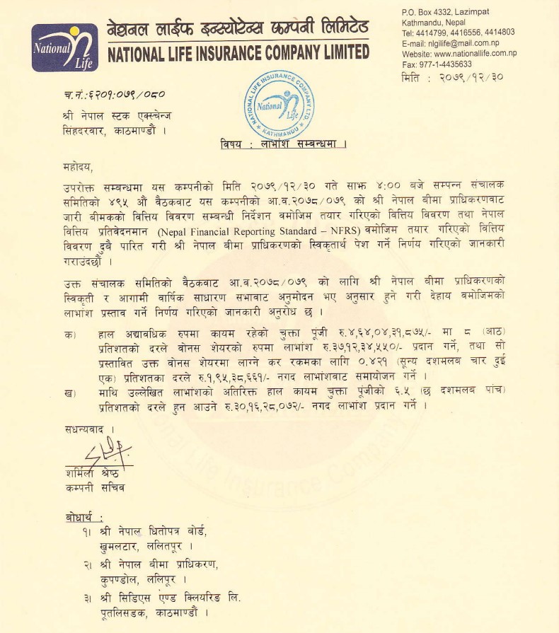 नेशनल लाइफद्धारा १४.५ प्रतिशत लाभांश घोषणा, ६.५ प्रतिशत नगद लाभांश दिने