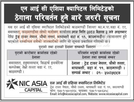 काठमाडौं । एनआईसी एशिया क्यापिटलले स्थान परिर्वत गरेको सूचना सार्वजनिक गरेको छ ।