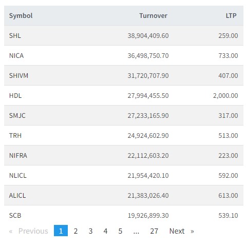 त्यस्तै, एनआईसी एशिया बैंक, शिव्म सिमेन्ट्स, हिमालयन डिष्टीलरी, सगरमाथा जलविधुत्, तारागाँउ रिजेन्सी, निफ्रा, नेशनल लाइफ, एशियन लाइफ र स्टान्डर्ड च्याटर बैंकको आज सर्वाधिक कारोबार भएको छ।
