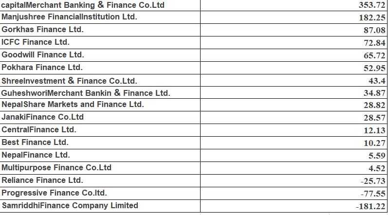 यस अवधिमा क्यापिटल मर्चेन्ट बैंकिङ एण्ड फाइनान्सको खुद नाफा सबैभन्दा धेरै ३५ करोड ३७ लाख रहेको छ । त्यस्तै मन्जुश्री फाइनान्सको खुद नाफा १८ करोड २२ लाख रहेको छ । त्यस्तै गोर्खाज फाइनान्सको खुद नाफा ८ करोड ७० लाख, आईसीएफसी फाइनान्सको खुद नाफा ७ करोड २८ लाख, गुडविल फाइनान्सको खुद नाफा ६ करोड ५७ लाख, तथा पोखरा फाइनान्सको खुद नाफा ५ करोड २९ लाख रहेको छ ।