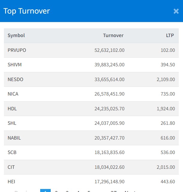 त्यस्तै, शिवम् सिमेन्ट्सको ३ करोड ९८ लाख, नेष्डो समृद्ध लघुवित्तको ३ करोड ३३ लाख, एनआइसी एशिया बैंकको २ करोड ६५ लाख र हिमालयन डिष्टिलरीको २ करोड ४२ लाख रुपैयाँमाथिको कारोबार भएको छ ।