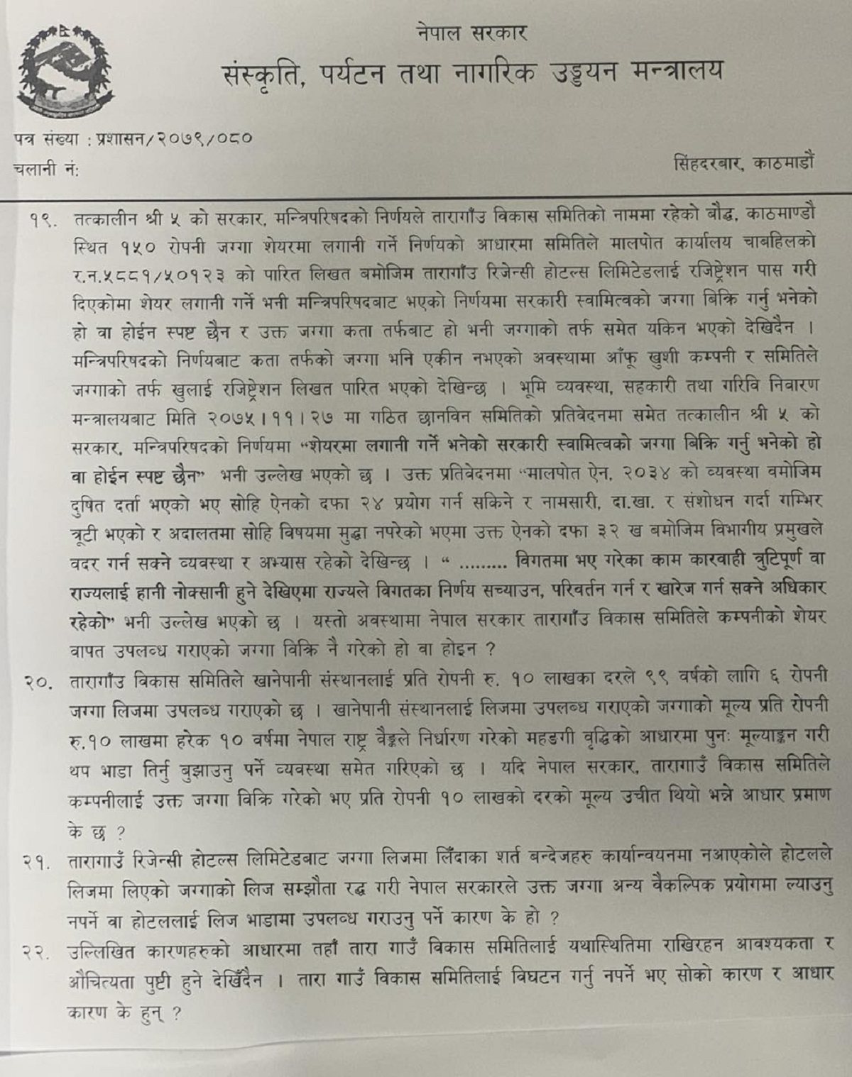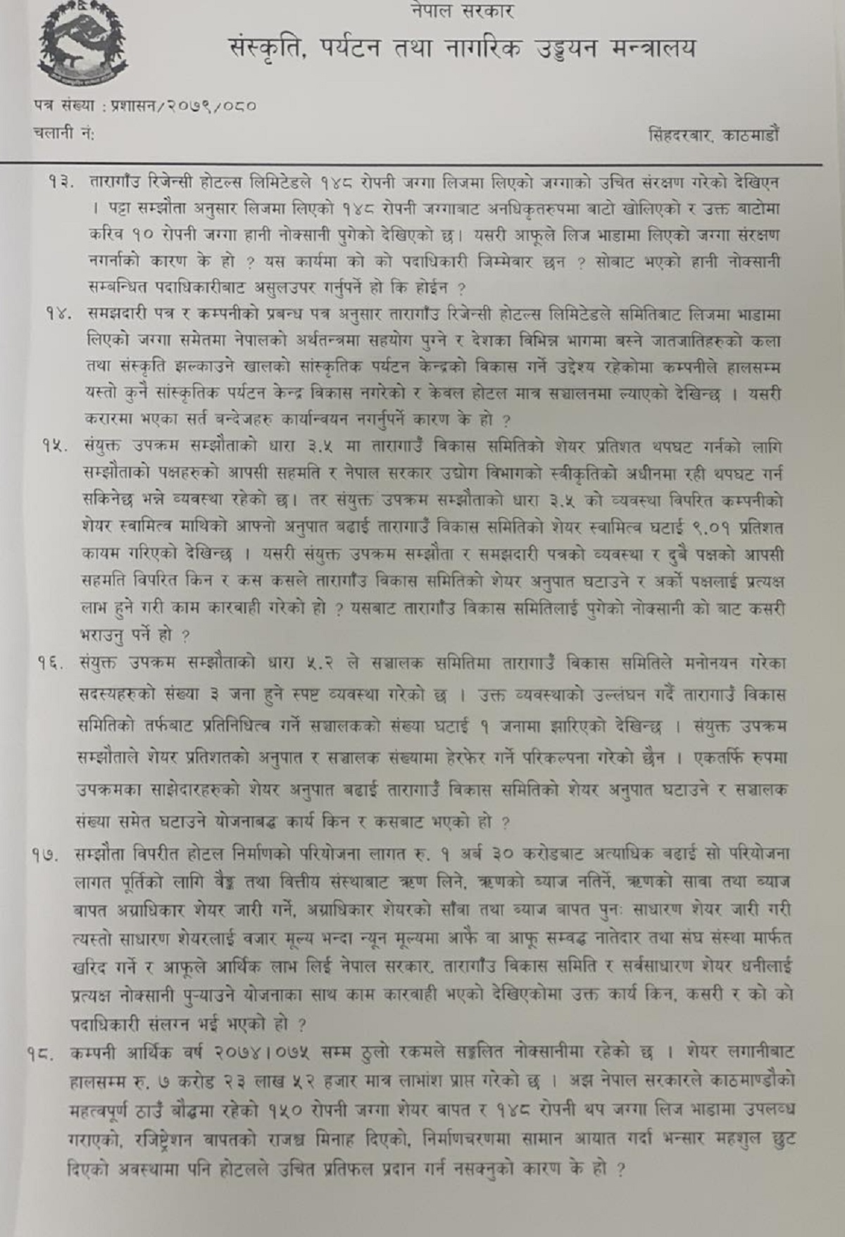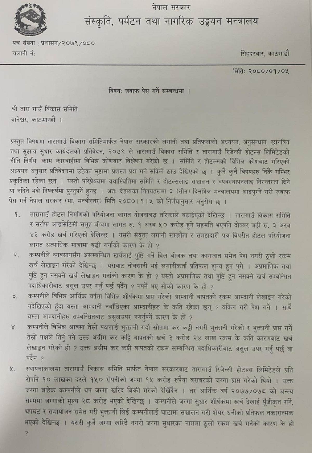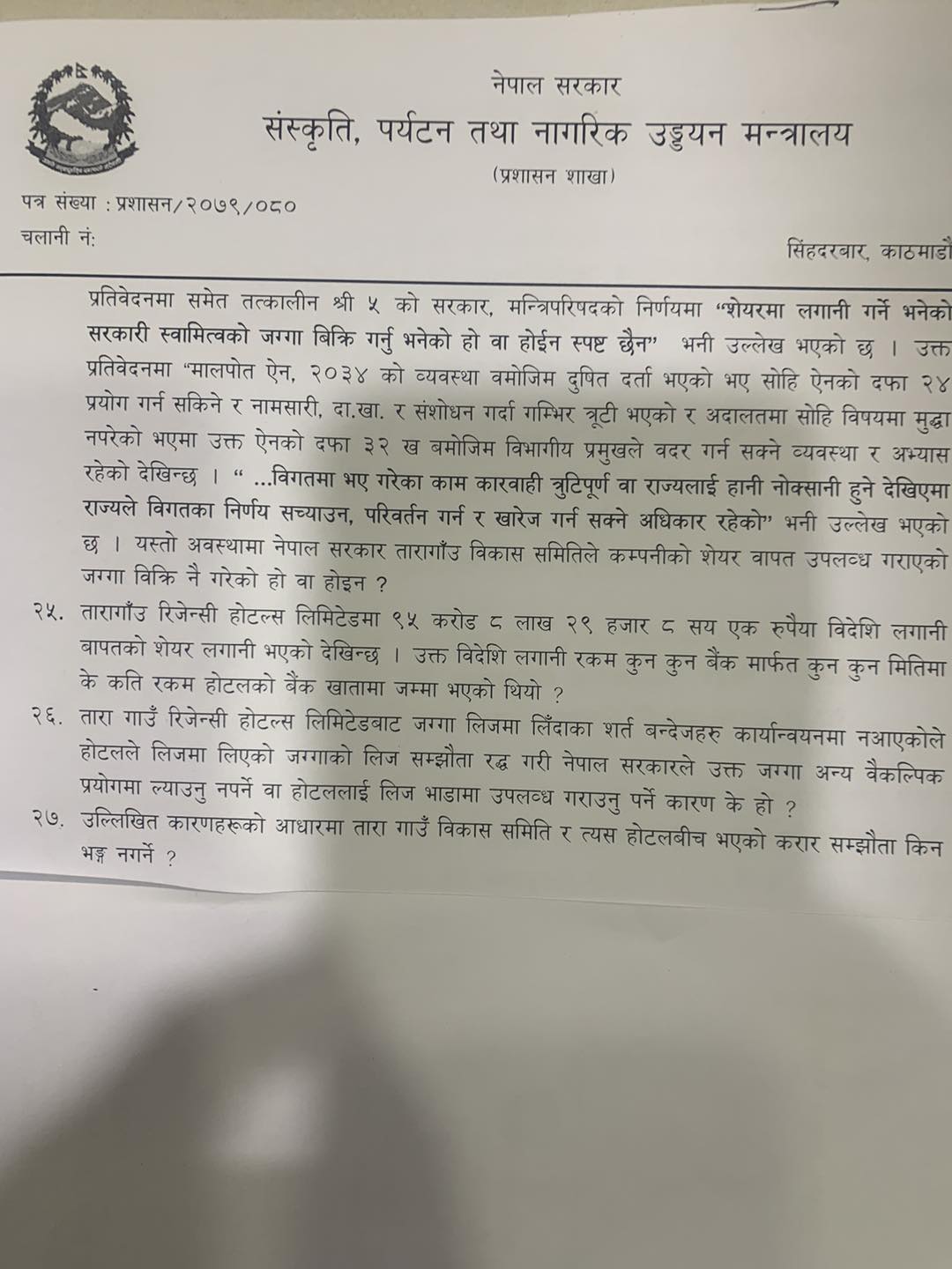 मन्त्रालयले आज बौद्धस्थित तारागाउँ रिजेन्सी होटल (ह्यात) लाई २७ बुँदे स्पष्टिरणको जवाफ तीन दिनभित्रमा पेश गर्न भन्दै बन्द किन नगर्ने भन्ने आशयको स्पष्टिकरण सोधेको छ । साथै तारागाउँ विकास समितिलाई समेत २२ बुँदे स्पष्टिकरण सोध्दै तारागाउँ हायात रिजेन्सी होटलमा भएको घोटाला काण्डमा संलग्नहरुलाई कारवाही गर्ने सम्बन्धमा स्पष्टिकरण सोधेको छ । मन्त्रालयले तारागाउँ विकास समितिको नाममा बौद्धमा रहेको १५० रोपनी जग्गामा गरिएको घोटाला, सो कार्यमा संलग्न पदाधिकारीहरुको विवरण पठाउन भनिएको छ । संस्कृति पर्यटन तथा नागरिक उड्डयन मन्त्री सुुदर किराँतीले कडा र चट्टानी अडानसाथ उक्त होटलको घोटाला काण्डमा छानविन अघि बढाएपछि नेपालको राजनीतिमा तरंग उत्पन्न हुने भएको छ ।