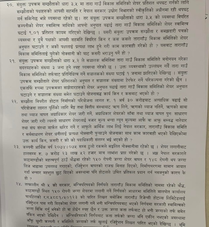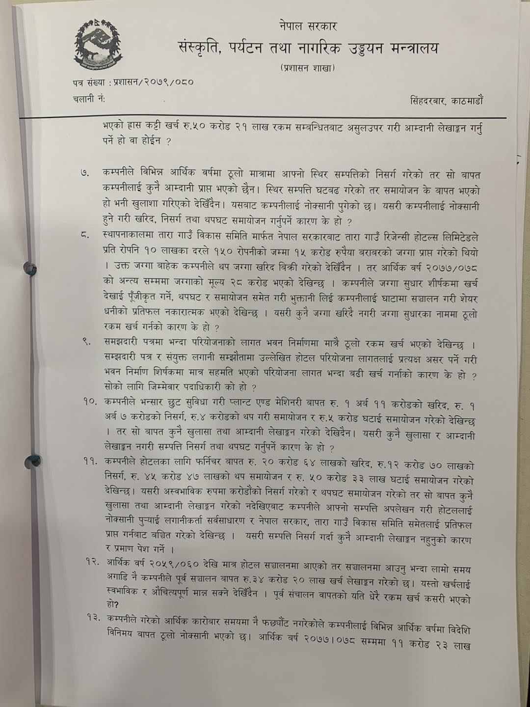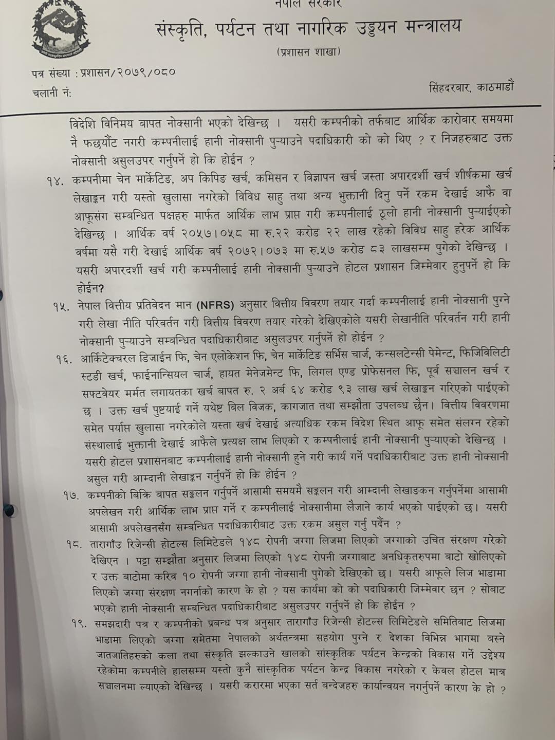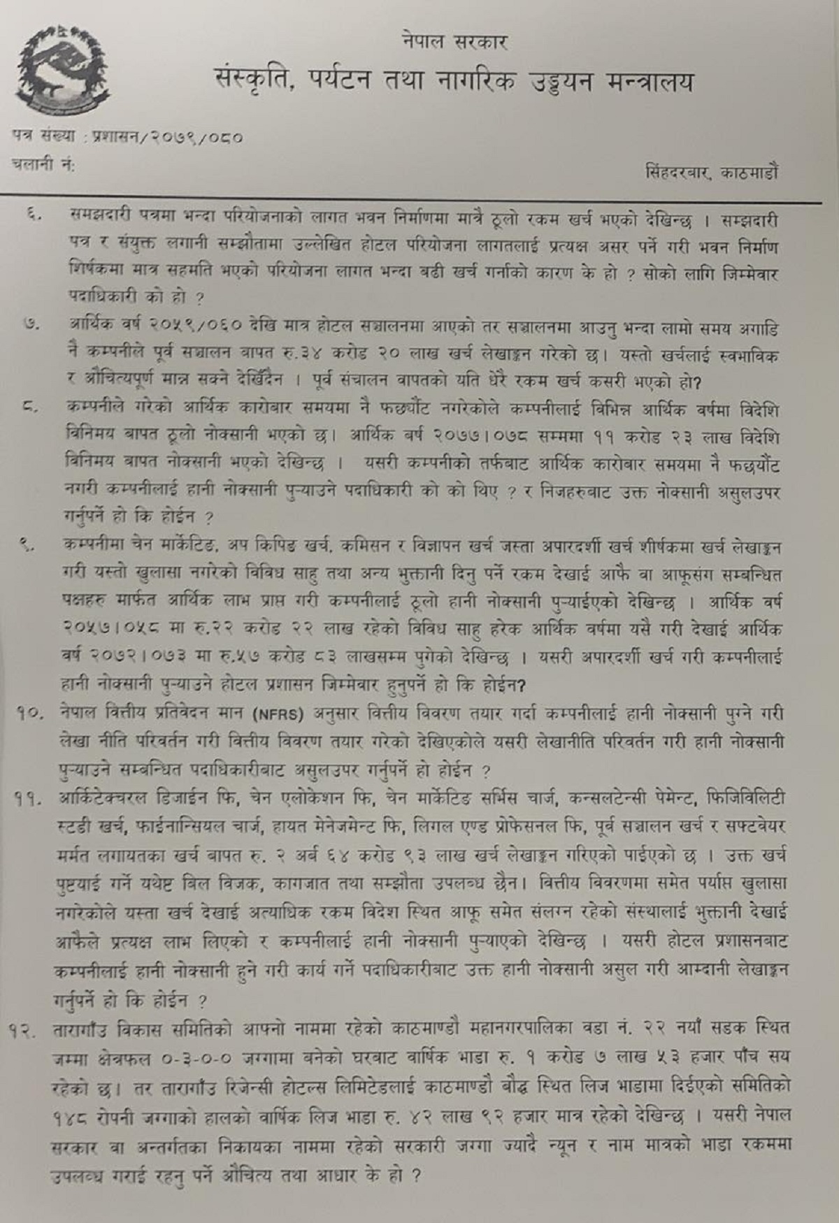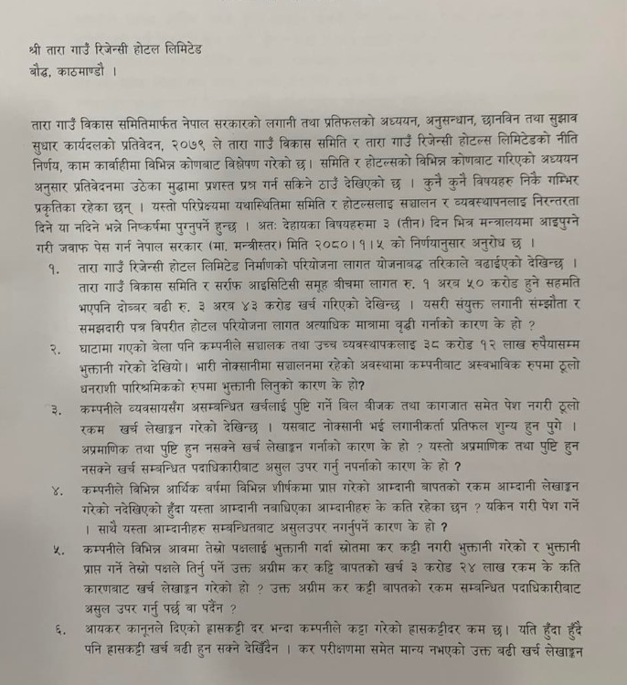 मन्त्रालयले आज बौद्धस्थित तारागाउँ रिजेन्सी होटल (ह्यात) लाई २७ बुँदे स्पष्टिरणको जवाफ तीन दिनभित्रमा पेश गर्न भन्दै बन्द किन नगर्ने भन्ने आशयको स्पष्टिकरण सोधेको छ । साथै तारागाउँ विकास समितिलाई समेत २२ बुँदे स्पष्टिकरण सोध्दै तारागाउँ हायात रिजेन्सी होटलमा भएको घोटाला काण्डमा संलग्नहरुलाई कारवाही गर्ने सम्बन्धमा स्पष्टिकरण सोधेको छ । मन्त्रालयले तारागाउँ विकास समितिको नाममा बौद्धमा रहेको १५० रोपनी जग्गामा गरिएको घोटाला, सो कार्यमा संलग्न पदाधिकारीहरुको विवरण पठाउन भनिएको छ । संस्कृति पर्यटन तथा नागरिक उड्डयन मन्त्री सुुदर किराँतीले कडा र चट्टानी अडानसाथ उक्त होटलको घोटाला काण्डमा छानविन अघि बढाएपछि नेपालको राजनीतिमा तरंग उत्पन्न हुने भएको छ ।